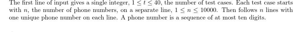 这些文件的格式是,第一行为单词表中的单词数 \(N\)(\(1 \le N \le 2000\)),下面每一行有一个单词,按字典顺序排列,中间也没有重复的单词。