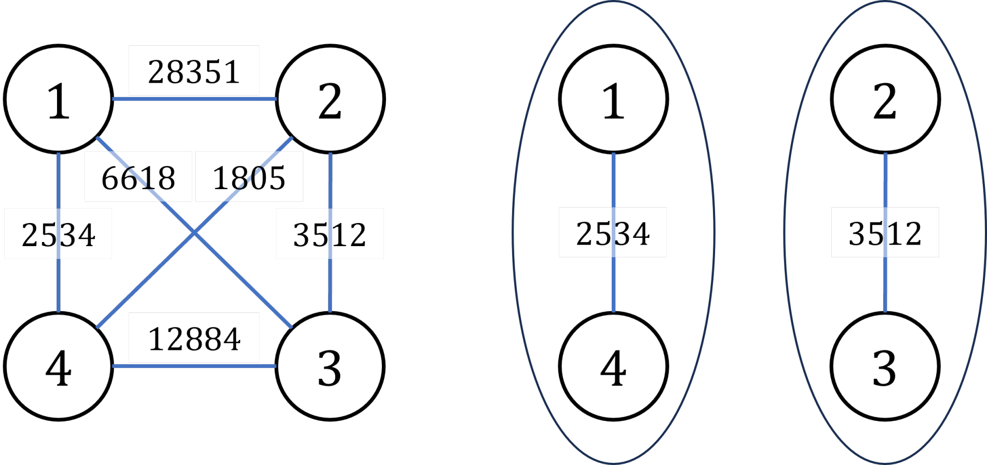 罪犯之间的怨气值如下面左图所示,右图所示为罪犯的分配方法,市长看到的冲突事件影响力是 \(3512\)(由 \(2\) 号和 \(3\) 号罪犯引发)。其他任何分法都不会比这个分法更优。